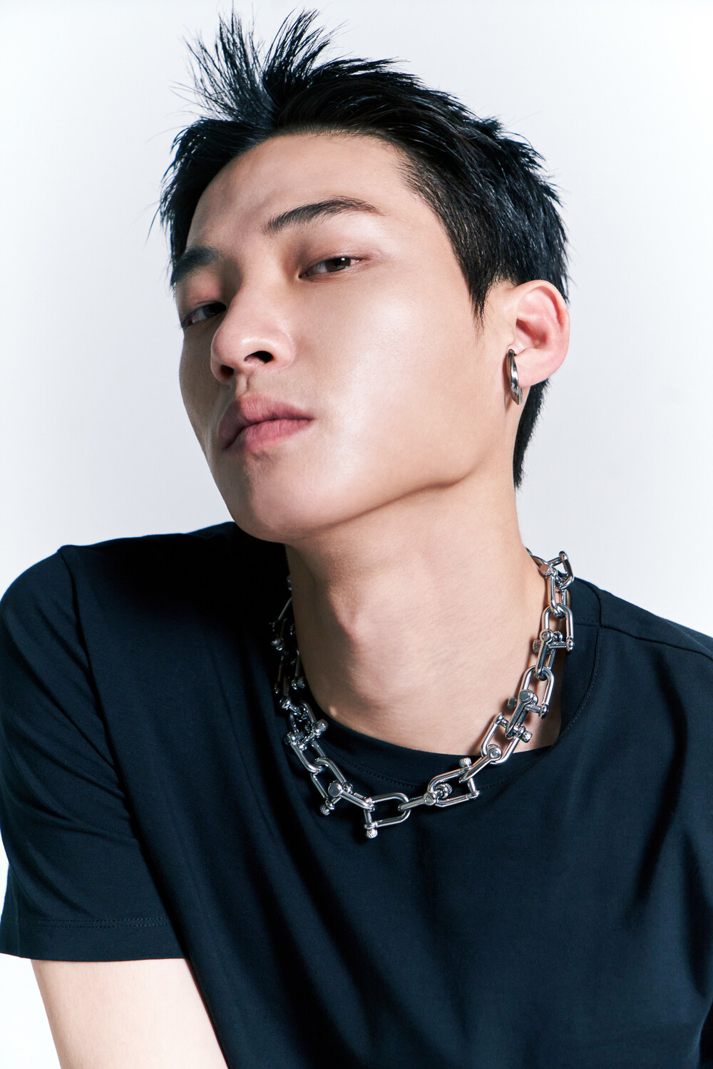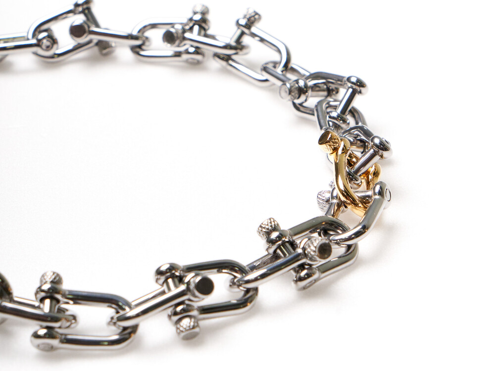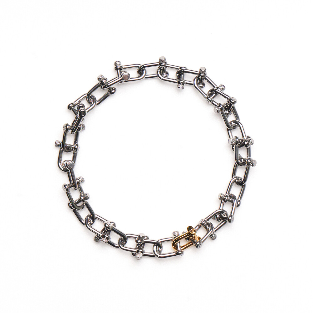 볼드한 네크리스로, 심플하거나 견고한 의상에 매치하기 좋은 아이템입니다. 브라스 소재로 도금처리 되어있어 변색이 되지 않습니다. 목 둘레, 원하는 기장에 따라 조절하여 때에 따라 조립할 수 있습니다.